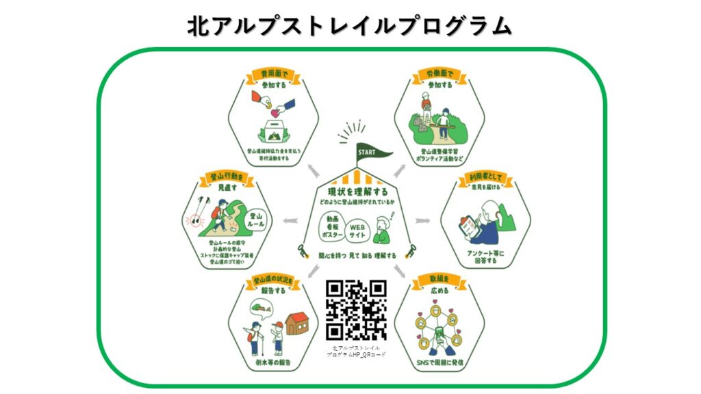北アルプストレイルプログラムを分かりやすく表現すると「利用者参加型制度」です。持続可能な登山道維持の実現を目指し、利用者にも登山道維持の取組に参加いただく制度となります。具体的な協力のあり方としては以下の7つがあげられます。