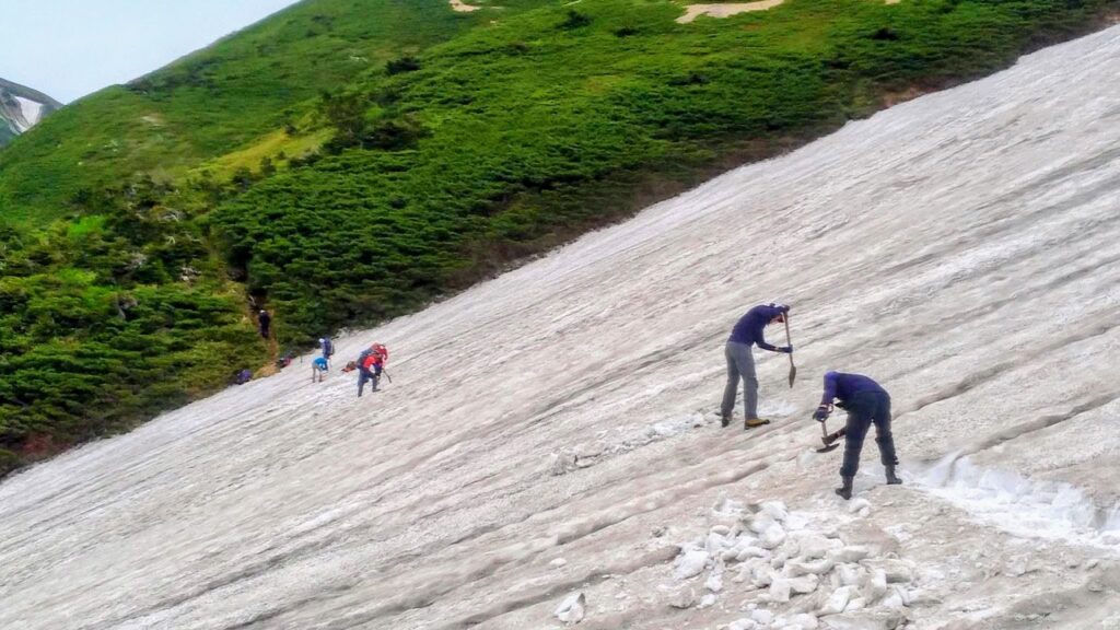 また雪渓は徐々に溶けていくため、一度整備をしたからといってその後に整備をしなくても良いというわけではなく、定期的なメンテナンスが必要です。その点も負担になっています。