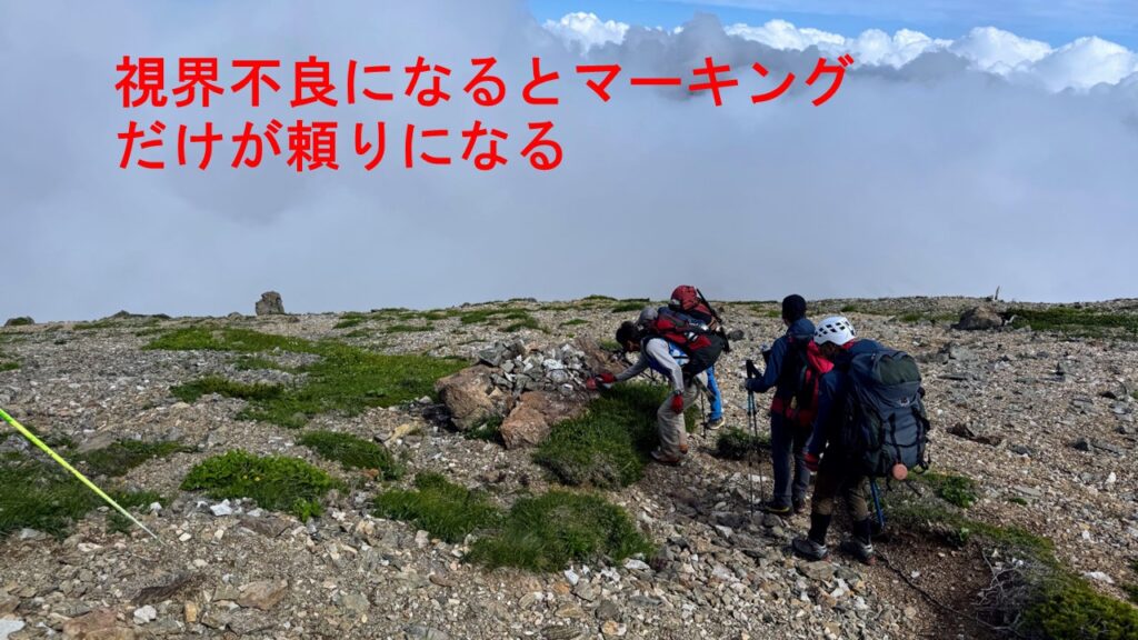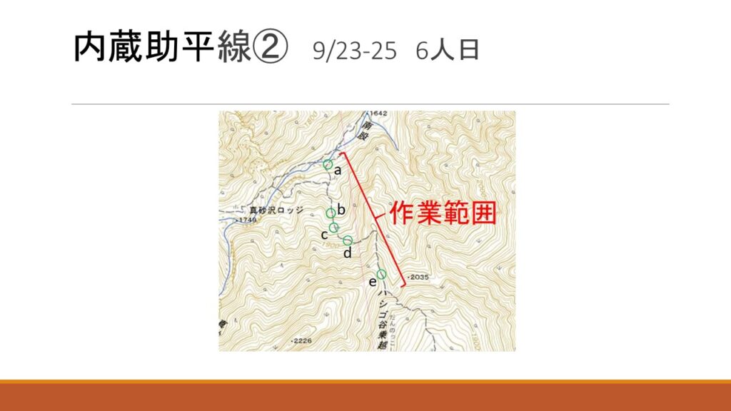 内蔵助平線分岐~ハシゴ谷乗越の区間は真砂沢ロッジが維持管理を担っていますが、その他にも担当エリアが広く、小屋からさける人工にも限りがあり大きな負担となっています。この区間での維持管理作業が実施されました。登山道マーキングの点検補修、転石の除去、刈払い等の整備を行いました。