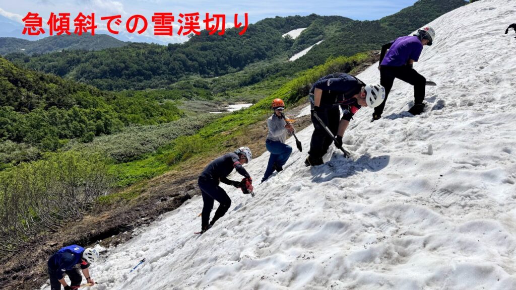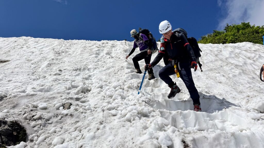 この時期の雪渓は固く締まっており、雪渓を切るのにも重労働となります。