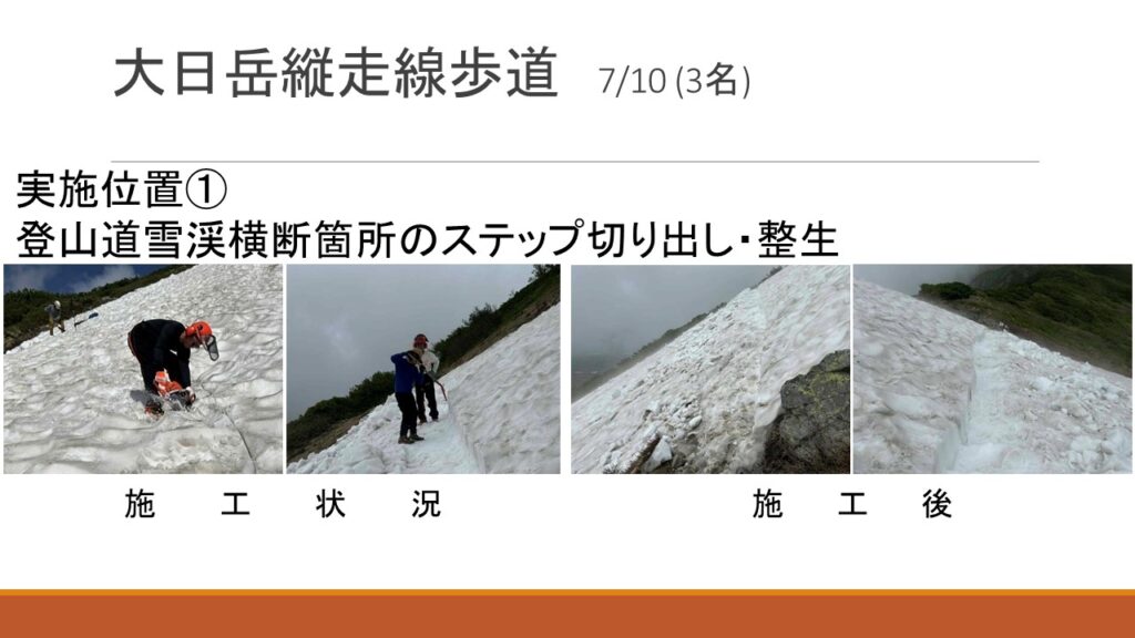 奥大日岳~雷鳥沢の区間の維持管理は大日小屋が担っており、雪渓が残るエリアは小屋から遠く離れた雷鳥沢方面にあります。現場へ出向くのにもかなりの重労働で、その支援としてガイド協会が雪渓切りの整備を行いました。整備にはスコップやチェンソーを使用してステップを切っていきました。