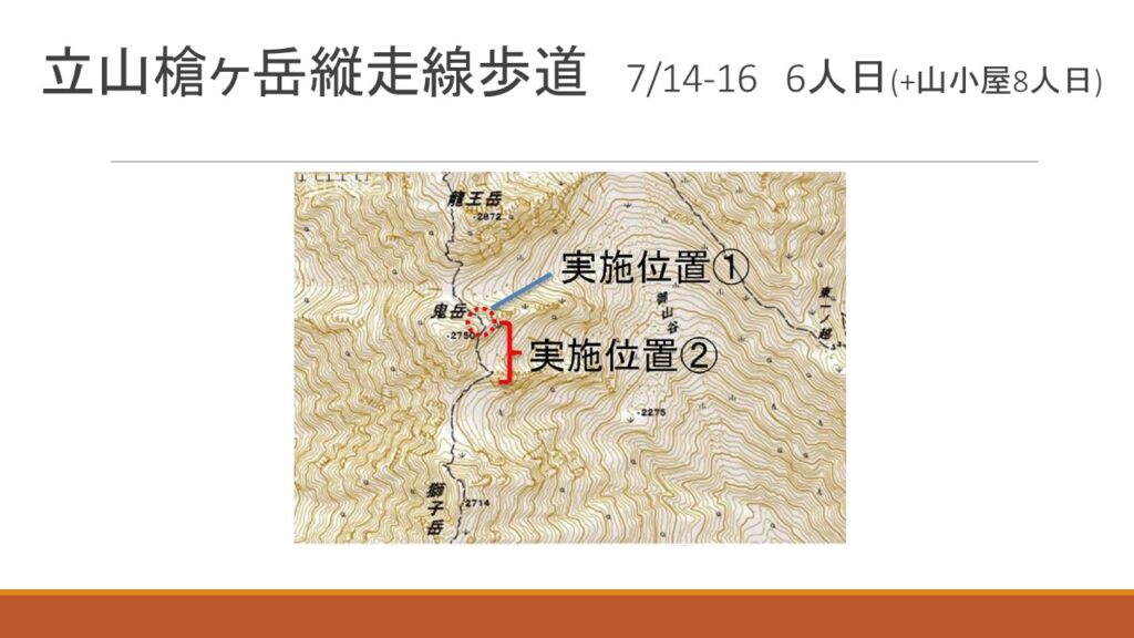 室堂から五色ヶ原へ向かう途中に鬼岳をトラバースする箇所があり、ここは毎年雪渓が遅くまで残る箇所になります。このエリアは五色ヶ原山荘が維持管理を担っておりますが、このエリアも小屋から離れており負担が大きい箇所になります。