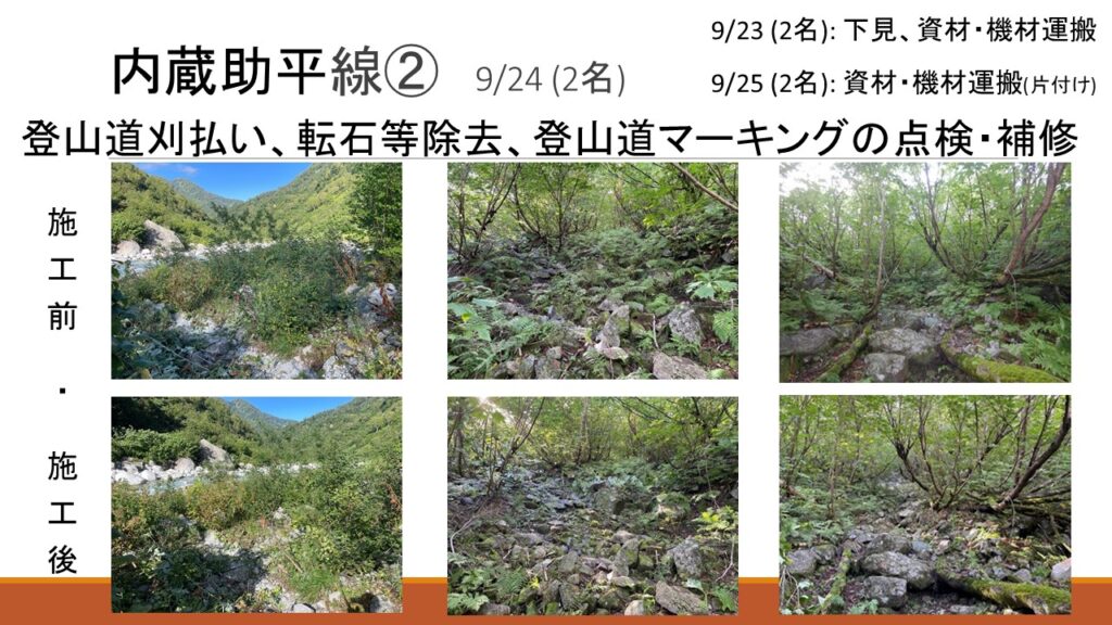 内蔵助平から内蔵助山荘の区間はとても山深く、限られた人が利用する道となっています。近年は維持管理が追い付かず、標高の低い箇所では登山道がわからなくなり藪状態となっている箇所もありました。今回の整備では藪となっている箇所において機械を使っての刈払いを行い、標高が高く岩場の急峻な場所では、ロープが設置されており、安全に使用できるかの点検補修が行われました。