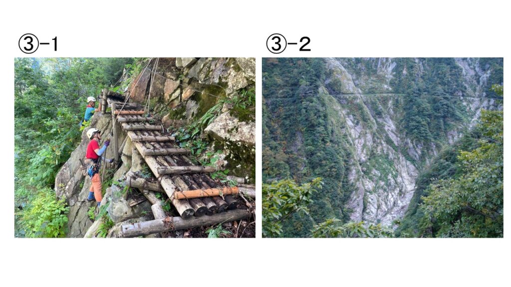 急峻な地形の中で鉄道や登山道の道があるだけですごいことですが、その背景に安全対策は重要となります。宇奈月方面山岳遭難対策協議会の隊員はロープで安全確保を必要とする危険な場所での整備も実施しています。